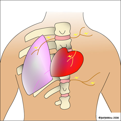 The nerves that leave your upper back go to your shoulders, back muscles, chest, breast area, heart, stomach, and your lungs.